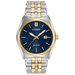 - Blue dial with gold-tone hour markers and hands including seconds hand