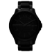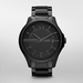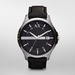 Dress down without sacrificing style: this casual watch from Armani Exchange boasts genuine leather and exact precision. Black leather strap with stainless steel round case, 46mm. Black dial features silver-tone hands and index hour markers, date window, and attractive logo. Quartz Movement. Water resistant to 50 meters.